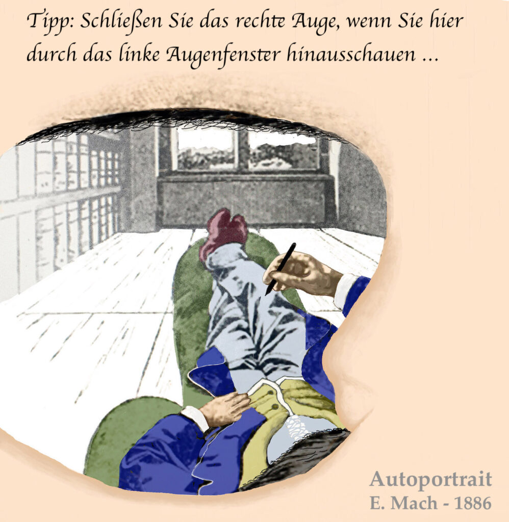 Die alltägliche Wahrnehmung suggeriert, dass mein ICH durch die Augenfenster in die Welt hinausschaut. Ich bin nicht die erste mit dieser Entdeckung – Das Selfi von Ernst Mach wird bald 140 Jahre alt . Es ist nicht die einzige dem Menschen mögliche Blick-Perspektive, aber eben die alltägliche.*) Und meines Wissens die einzige für das Einander-erblicken.